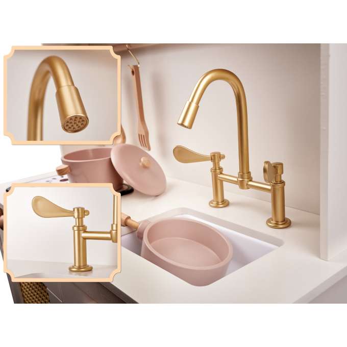 Virtuvė žavi savo detalemis. Subtilios spalvos ir tikslus stalviršių, spintelių, maišytuvo atkartojimas sužavės tiek vaiką, tiek tevelius.